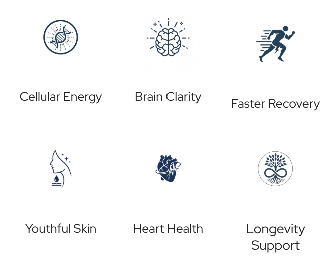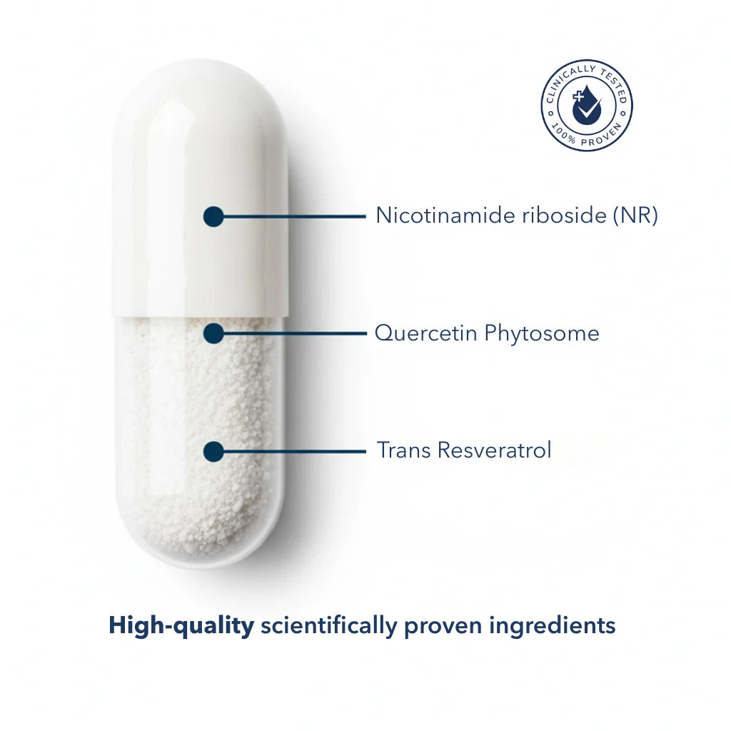 Three scientifically-backed compounds working in synergy to restore cellular energy, activate longevity genes, and support healthy aging from within.